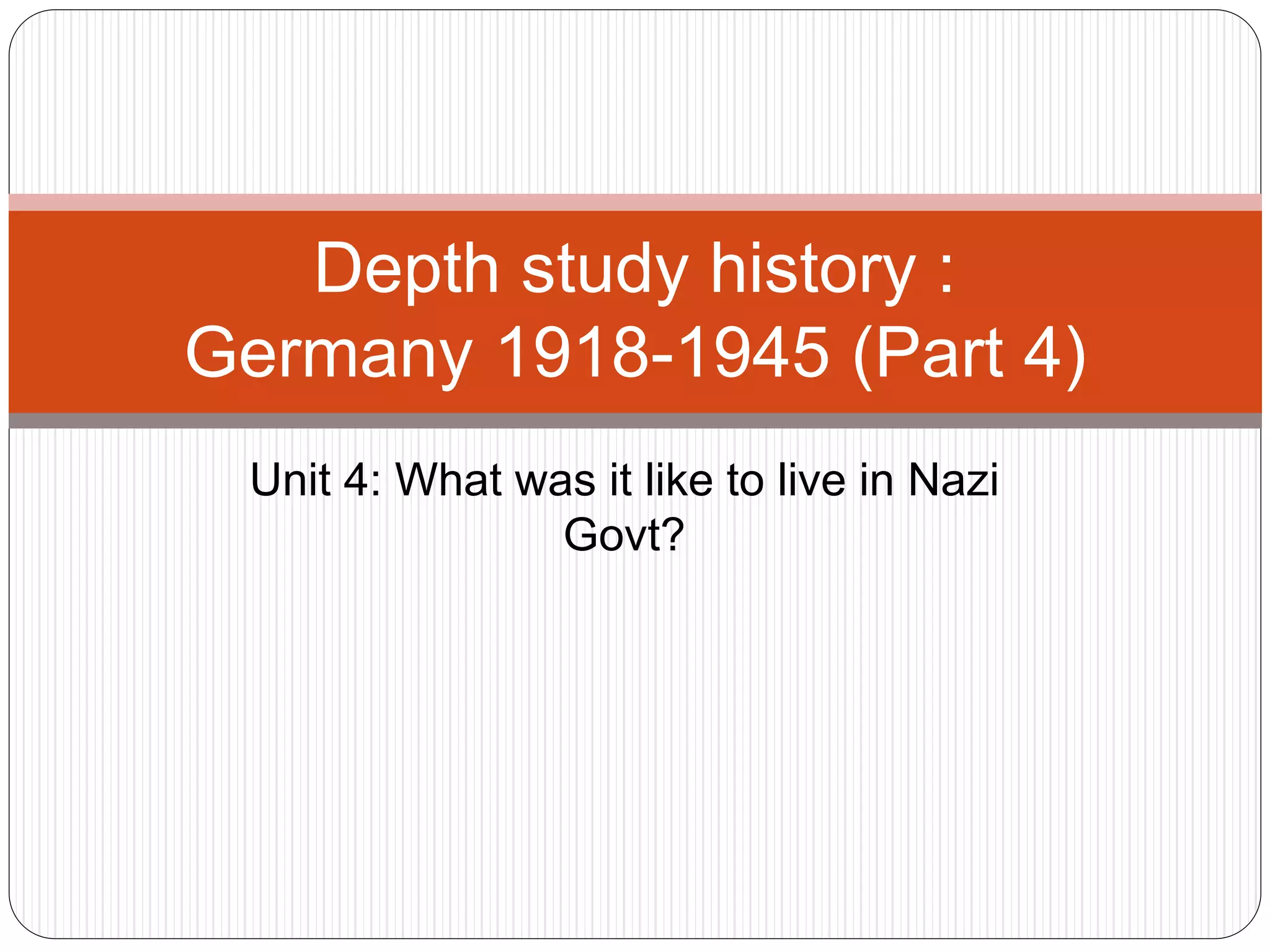 Nazi Germany implemented policies to control and indoctrinate the youth through schools and the Hitler Youth organization. Boys were given military training to serve as future soldiers, while girls were prepared for motherhood. The Nazi regime also pursued policies to increase the birth rate by encouraging marriage and childrearing while restricting women's roles. Most Germans benefited economically from reduced unemployment and support for farmers and businesses during Nazi rule. However, life deteriorated with the outbreak of World War 2 due to food and supply shortages, bombing of cities, and total mobilization of the economy for war. The Holocaust led to the mass murder of 6 million Jews in death camps across Nazi-occupied Europe.