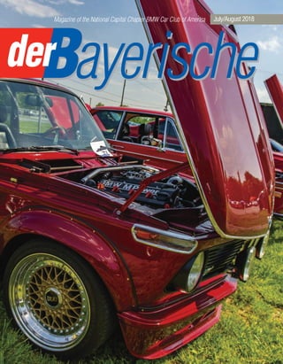 The July/August 2018 issue of the National Capital Chapter BMW Car Club magazine highlights successful events like Chapterfest at Summit Point Motorsports Park, which featured multiple activities including a people's choice car show and performance laps. It emphasizes the club's community engagement, upcoming activities such as Oktoberfest, and encourages members to support sponsors. Additionally, it acknowledges the contributions of numerous volunteers and sponsors for making these events successful.