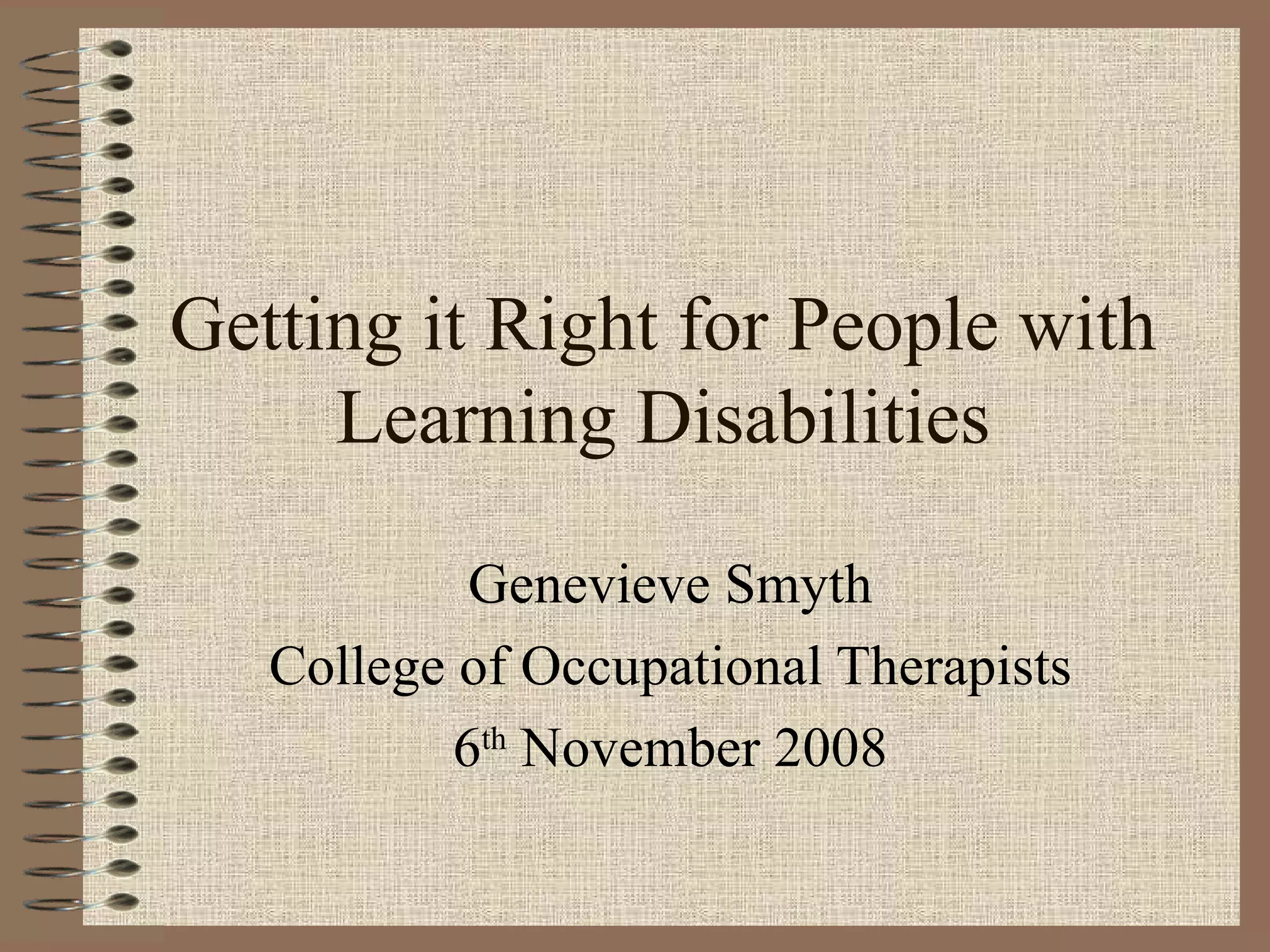 The document summarizes background information on healthcare inequalities faced by people with learning disabilities. It then outlines the work of the "Getting it Right" group, which aims to improve healthcare professionals' ability to treat people with learning disabilities. The group is made up of various organizations and produces guidance on communicating effectively with people with learning disabilities and understanding their rights. It concludes by mentioning an update on challenging behavior.