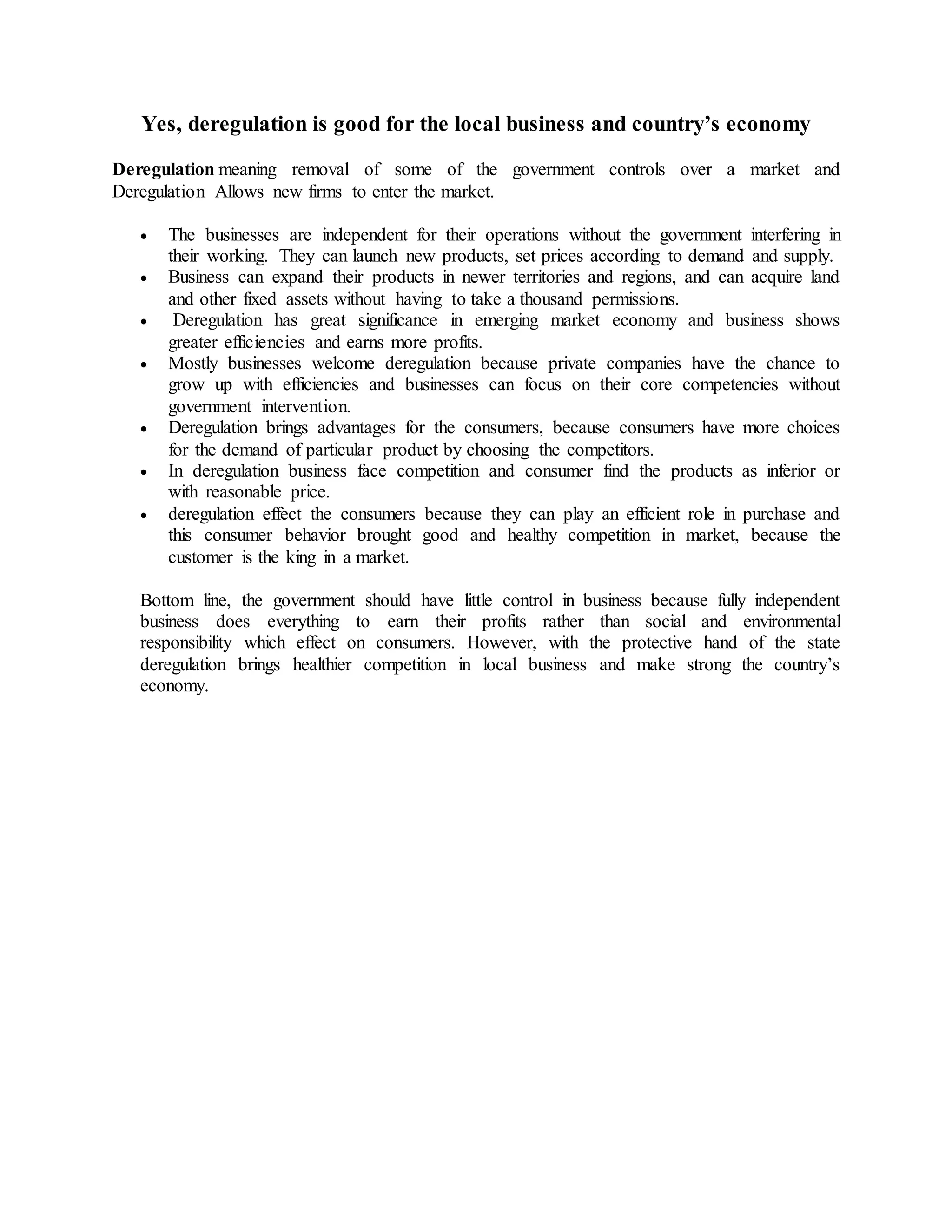 Deregulation removes some government controls over markets to allow more competition and independence for businesses. It allows new firms to enter markets and gives businesses freedom to launch new products, set prices, expand into new areas, and acquire assets without extensive permissions. Deregulation benefits consumers through more choices and potential for lower prices due to increased competition and incentives for businesses to be more efficient. However, complete deregulation may risk businesses prioritizing profits over social and environmental responsibilities. Overall, the document argues that limited deregulation can strengthen local businesses and the national economy by fostering healthier competition.