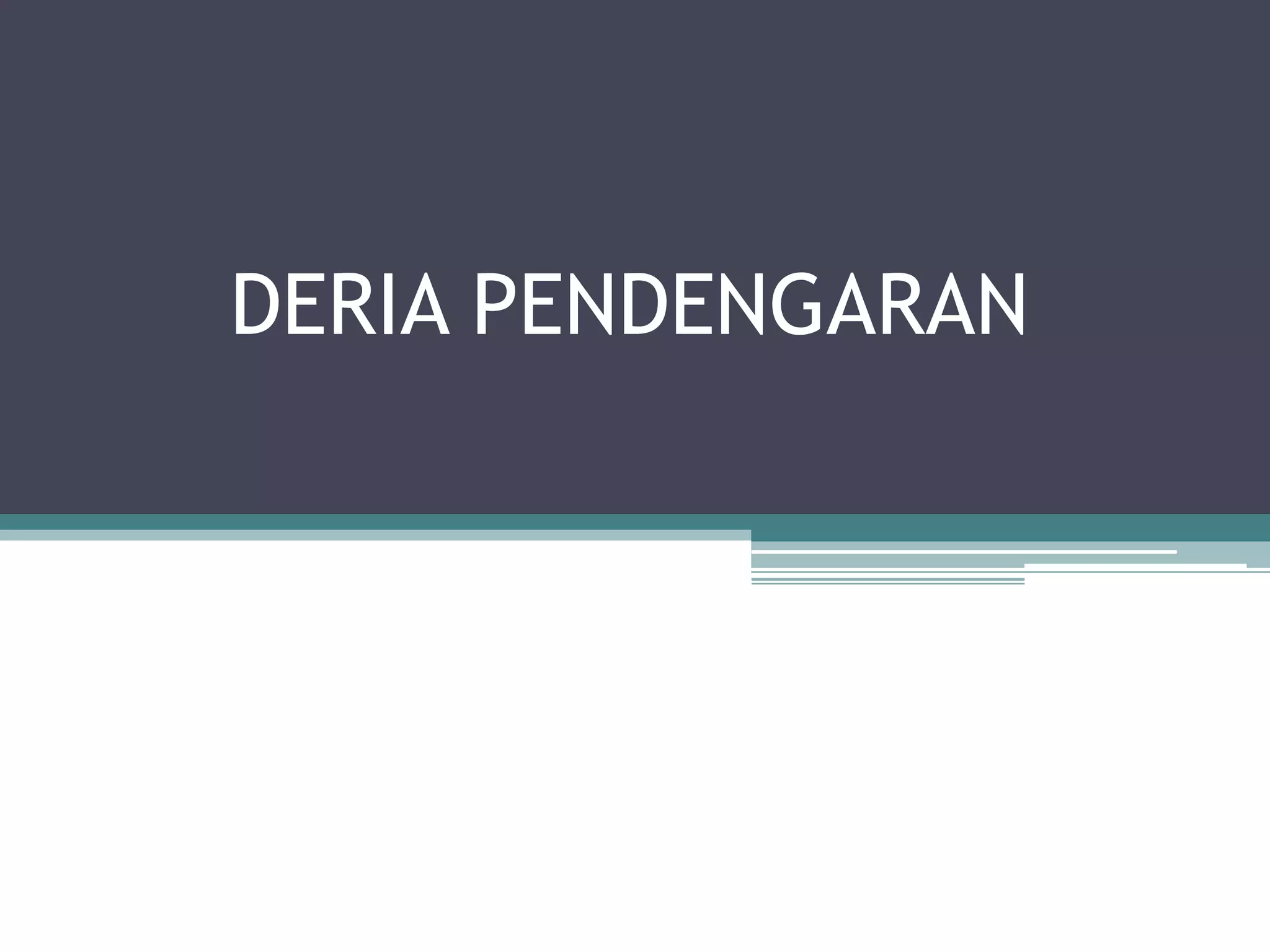 Dokumen ini menerangkan mengenai organ pendengaran, termasuk struktur dan fungsi telinga. Ia menerangkan bagaimana bunyi dirangsang dan dihantar ke otak melalui pelbagai komponen seperti gegendang telinga, tulang osikel, dan koklea. Selain itu, dokumen juga menyebut tentang fungsi bahagian telinga yang tidak terlibat dalam pendengaran, seperti salur separuh bulat dan tiub eustachio.