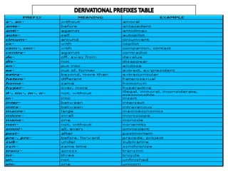 This document presents information on derivation and inflection in linguistics. It defines derivational morphemes as affixes that change the meaning or function of a word to create a new lexeme. Inflectional morphemes are affixes that carry grammatical meaning without changing the part of speech or core meaning. Examples of common derivational and inflectional suffixes are provided along with their grammatical functions.