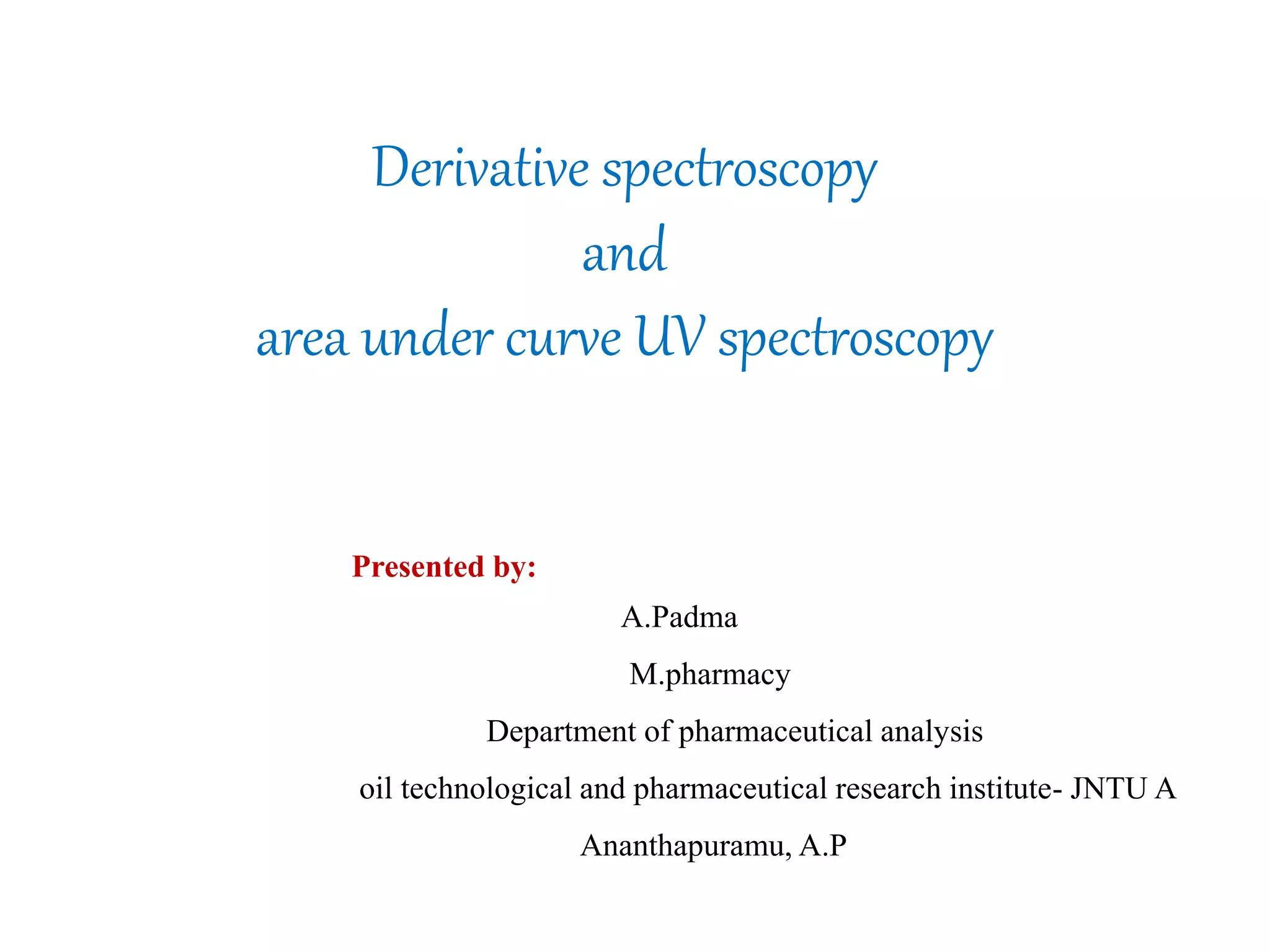 Derivative spectroscopy involves converting a normal absorption spectrum into its first or second derivative spectrum. This allows for more precise determination of the wavelength of maximum absorption and improved spectral resolution. The first derivative spectrum plots the rate of change of absorbance versus wavelength and shows a maximum, minimum and zero crossing at the absorption band's wavelength. The second derivative shows two satellite maxima with an inverted band minimum at the wavelength of maximum absorption. Area under curve spectroscopy calculates the integrated absorbance value over a specified wavelength range, graphically representing the area under the absorption curve. Both techniques have applications in pharmaceutical analysis for multicomponent assays and determination of physical constants.