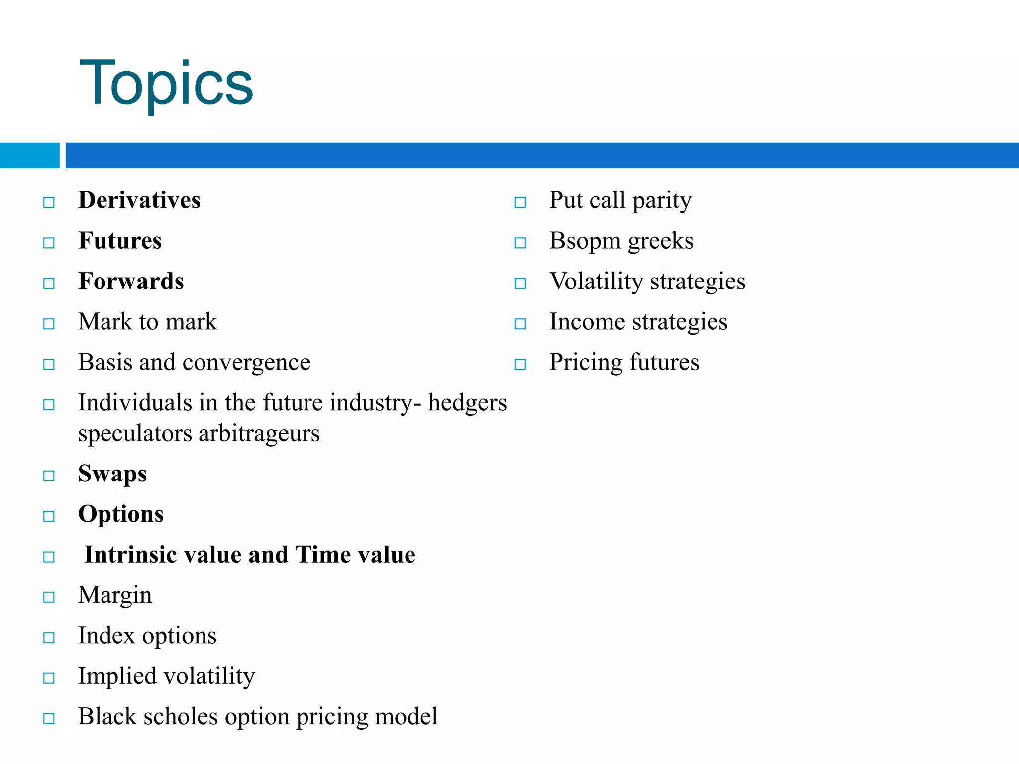 The document discusses derivatives, which are financial instruments whose value is based on an underlying asset. It covers various types of derivatives like futures, forwards, swaps, and options. Futures are standardized contracts to buy or sell an asset at a future date, while forwards involve customized non-standardized contracts. Swaps involve exchanging cash flows between two parties. Options give the holder the right but not obligation to buy or sell the underlying asset.
