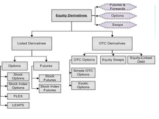 1. The document discusses various types of derivatives including equity derivatives, forwards, futures, options, swaps, and warrants.