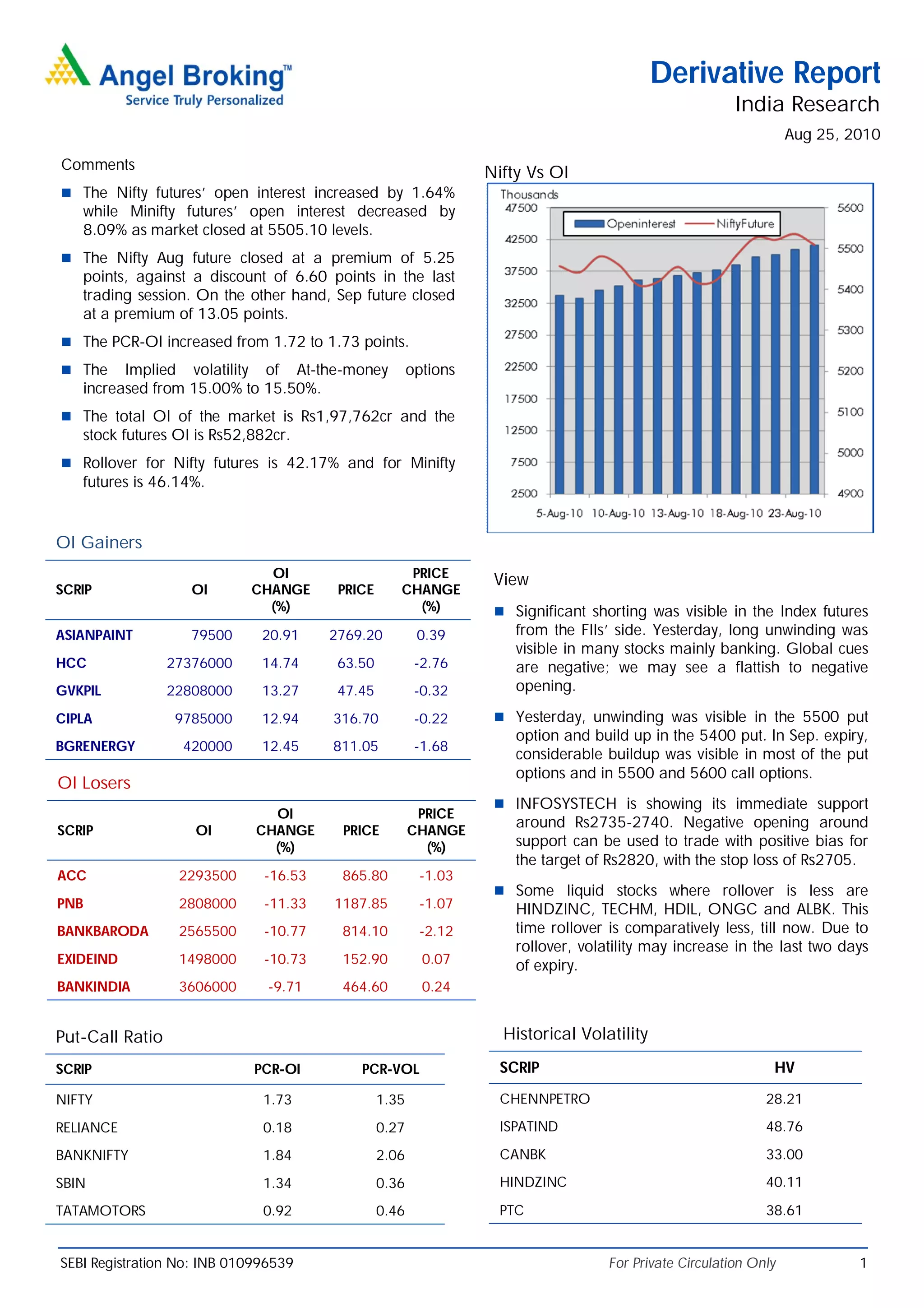 The derivative report summarizes developments in the Indian derivatives market on August 25, 2010. Open interest in Nifty futures increased by 1.64% while open interest in Minifity futures decreased by 8.09%. The Nifty August future closed at a premium while the September future closed at a higher premium. Key put-call ratios and historical volatilities are also mentioned. Some stocks that saw significant changes in open interest are highlighted.