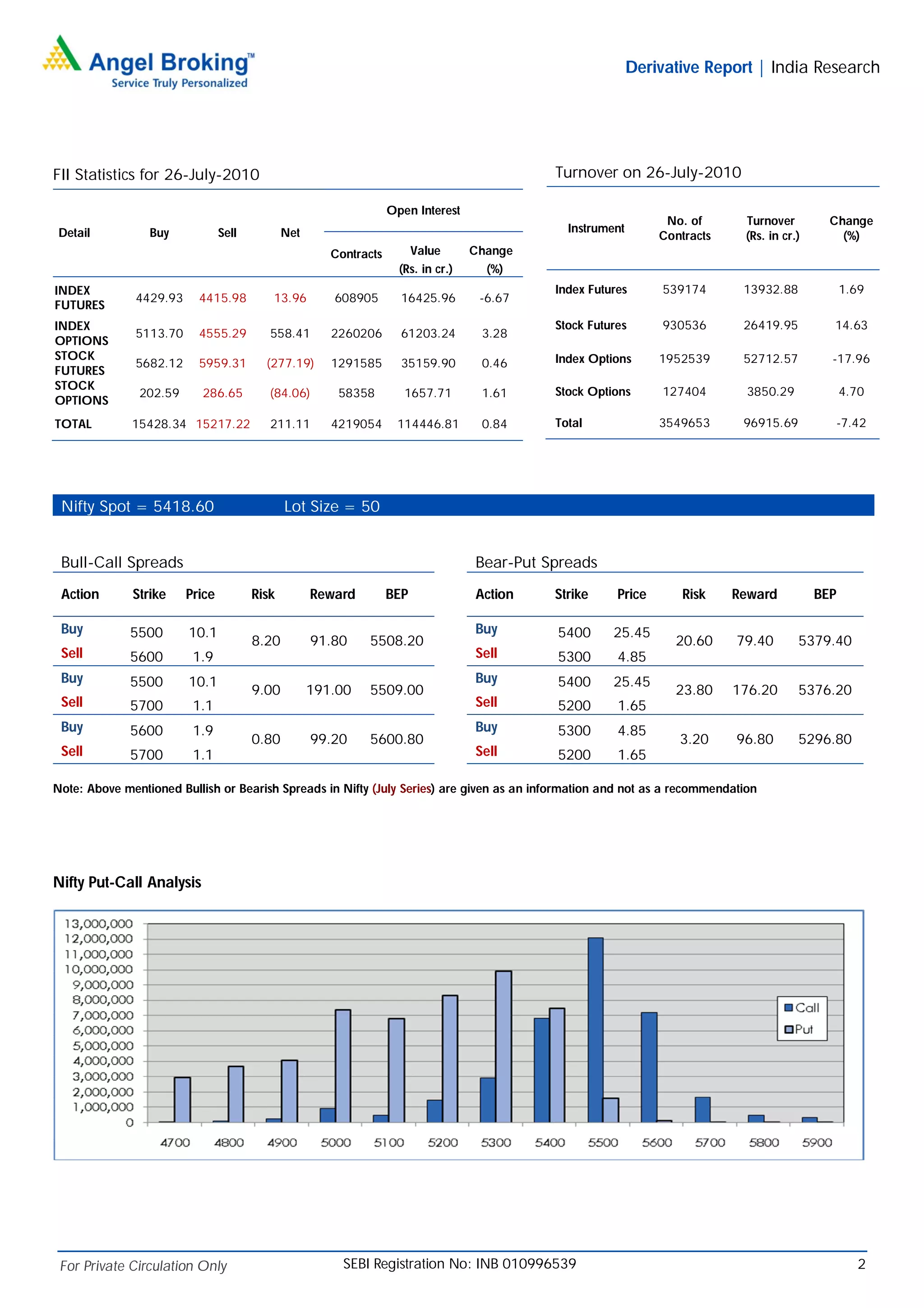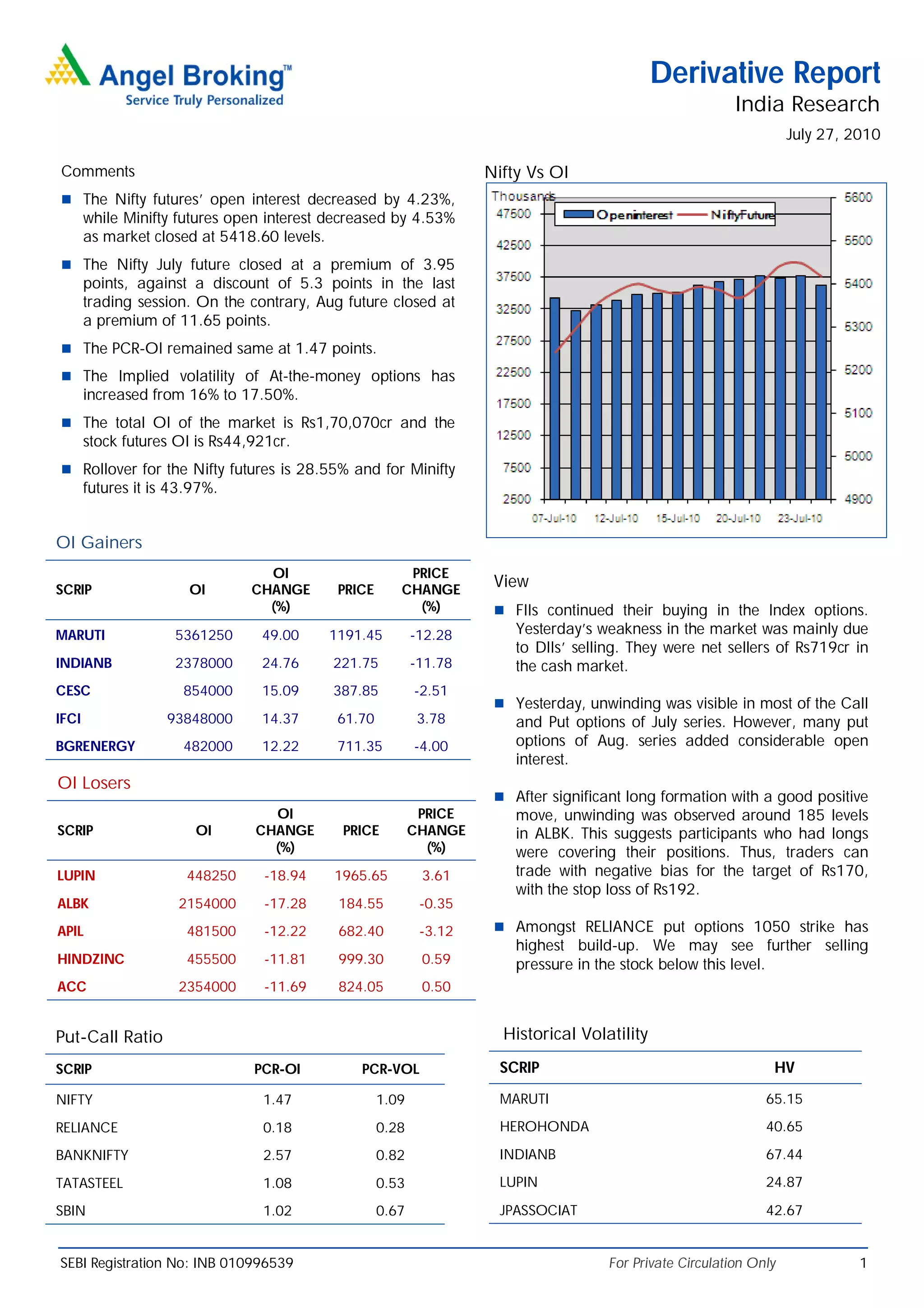 The document provides a summary of derivative market activity in India for July 27, 2010. Key points include: