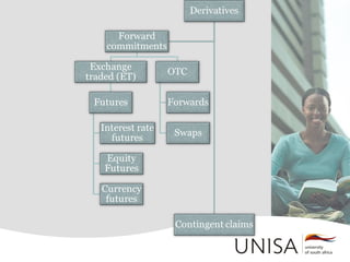 The document outlines the course information for INV3703: Derivatives at the University of South Africa, including details on lectures, exams, and reference materials. It covers fundamental concepts of derivatives such as forward contracts, futures contracts, swaps, and options, alongside their pricing, valuation, and market characteristics. The text includes various practical examples and calculations related to the derivatives market, emphasizing the distinction between forwards and futures, as well as the basic elements of option contracts.