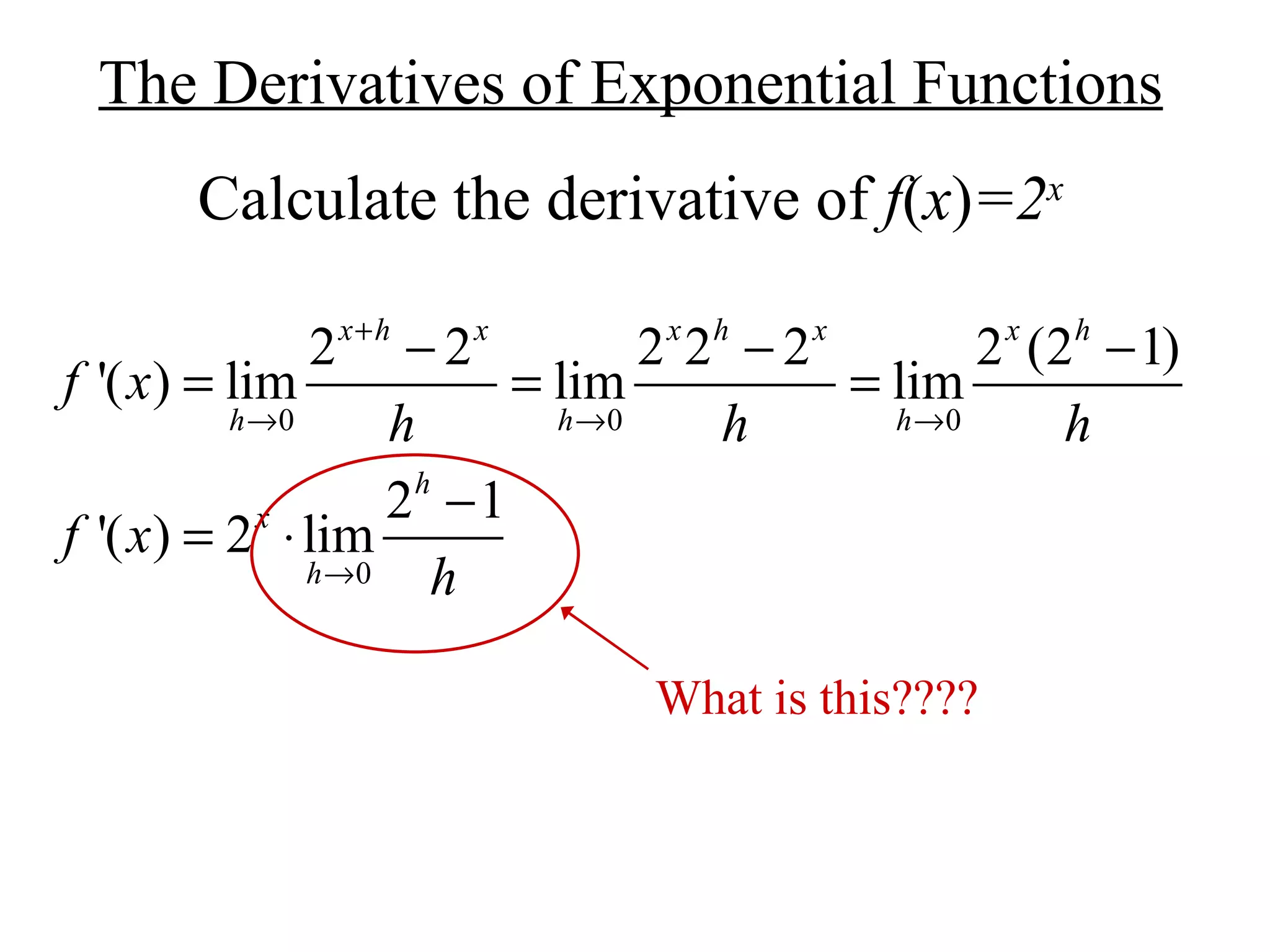 The document discusses calculating the derivative of exponential functions like f(x)=2^x. It provides a table of values of (2^x - 2^(x+h))/h as h approaches 0, showing the limit is approximately 0.693. This suggests the derivative of 2^x is proportional to 2^x with a constant of 0.693. A second table shows how the derivative of a^x is related to the value of a, with the derivative being a when a=1.