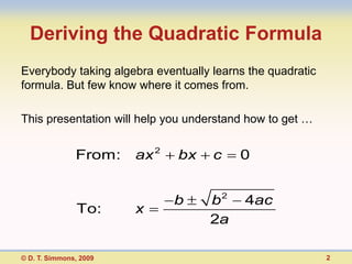 The document derives the quadratic formula step-by-step: [1] It begins with the standard quadratic equation ax2 + bx + c = 0 and transforms it through steps such as completing the square and applying the square root property, [2] This results in the familiar quadratic formula of x = (-b ± √(b2 - 4ac)) / 2a, which gives the solutions to any quadratic equation.