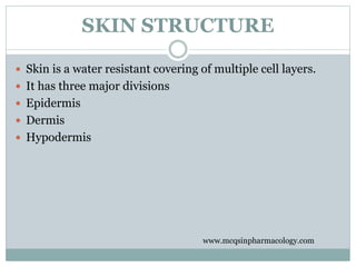 The document provides an overview of dermal toxicology, detailing the structure and functions of skin layers, the metabolism of xenobiotics, and the effects of toxicants on skin health. It discusses various skin conditions caused by exposure to toxic substances, including allergic reactions, photosensitization, hyperkeratosis, and different types of skin cancer. Management strategies and preventive measures for skin-related toxicities are also outlined.