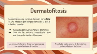 El documento aborda la dermatofitosis, una infección fúngica crónica de la piel, el cabello o las uñas, causada por hongos del género Trichophyton, Microsporum y Epidermophyton. Se detallan las características de diferentes tipos de dermatofitos, las patologías que causan, así como sus modos de transmisión, diagnóstico y tratamiento. Además, se incluye un caso clínico que ilustra una infección facial y su tratamiento efectivo con ketoconazol.