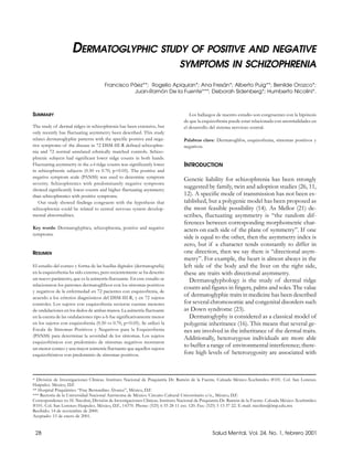 This study examined the relationship between dermatoglyphic patterns, fluctuating asymmetry, and positive and negative symptoms in schizophrenia. 72 schizophrenia patients and 72 controls were studied. Schizophrenic subjects had significantly lower ridge counts in both hands compared to controls. Fluctuating asymmetry was significantly higher in schizophrenic subjects. Schizophrenics with predominantly negative symptoms showed significantly lower ridge counts and higher fluctuating asymmetry than schizophrenics with positive symptoms. The findings support the hypothesis that schizophrenia could be related to central nervous system developmental abnormalities.