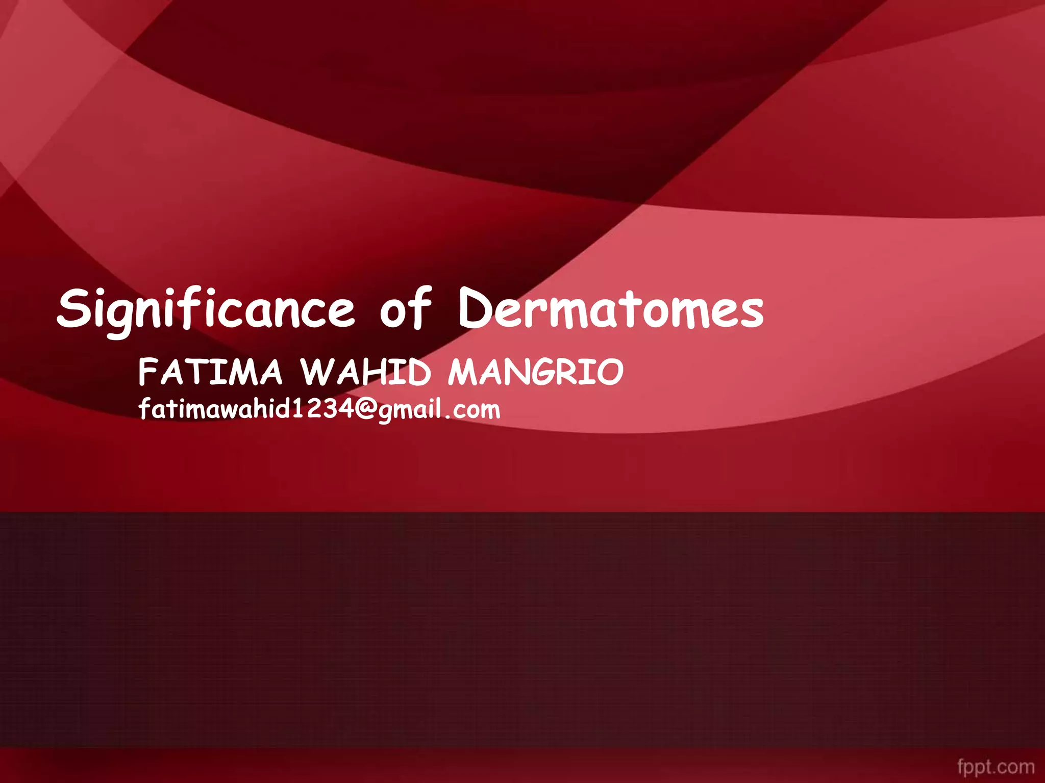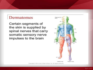 Dermatomes are areas of skin supplied by single spinal nerves. There are 31 pairs of spinal nerves grouped into cervical, thoracic, lumbar, sacral, and coccygeal nerves. Each dermatome transmits sensory details from its area of skin back to the brain. Dermatomes are important because symptoms occurring along specific dermatomes can help diagnose conditions like problems with nerve roots in the spine or shingles, where reactivated chickenpox virus causes pain and rashes along affected dermatomes.