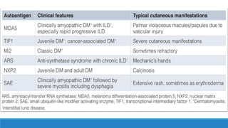 Dermatomyositis is a rare autoimmune disease characterized by muscle weakness and a skin rash. It affects the skin, muscles, lungs, heart, and gastrointestinal system. Genetic and environmental factors may play a role in its development. Diagnosis involves assessing muscle weakness, increased muscle enzymes, skin changes like a heliotrope rash or Gottron's papules, and muscle biopsy. Treatment focuses on immunosuppressants, corticosteroids, immunoglobulins, and physical therapy to maintain muscle strength and function.