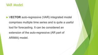 1. A VAR model comprises multiple time series and is an extension of the autoregressive model that allows for feedback between variables.