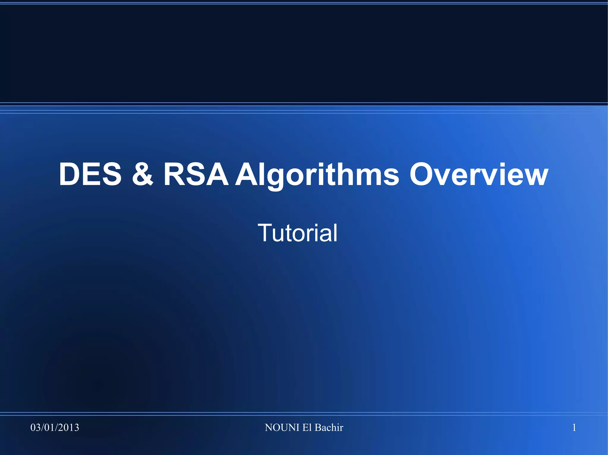 This document provides an overview of the DES and RSA encryption algorithms. DES is a symmetric algorithm that is fast for large data sizes but requires securely exchanging keys, while RSA is an asymmetric algorithm that is slower for large data sizes but uses public/private key pairs to encrypt and decrypt. The document then demonstrates implementing DES and RSA encryption using the OpenSSL tool, including generating keys, encrypting and decrypting files, and best practices for key exchange between two parties.