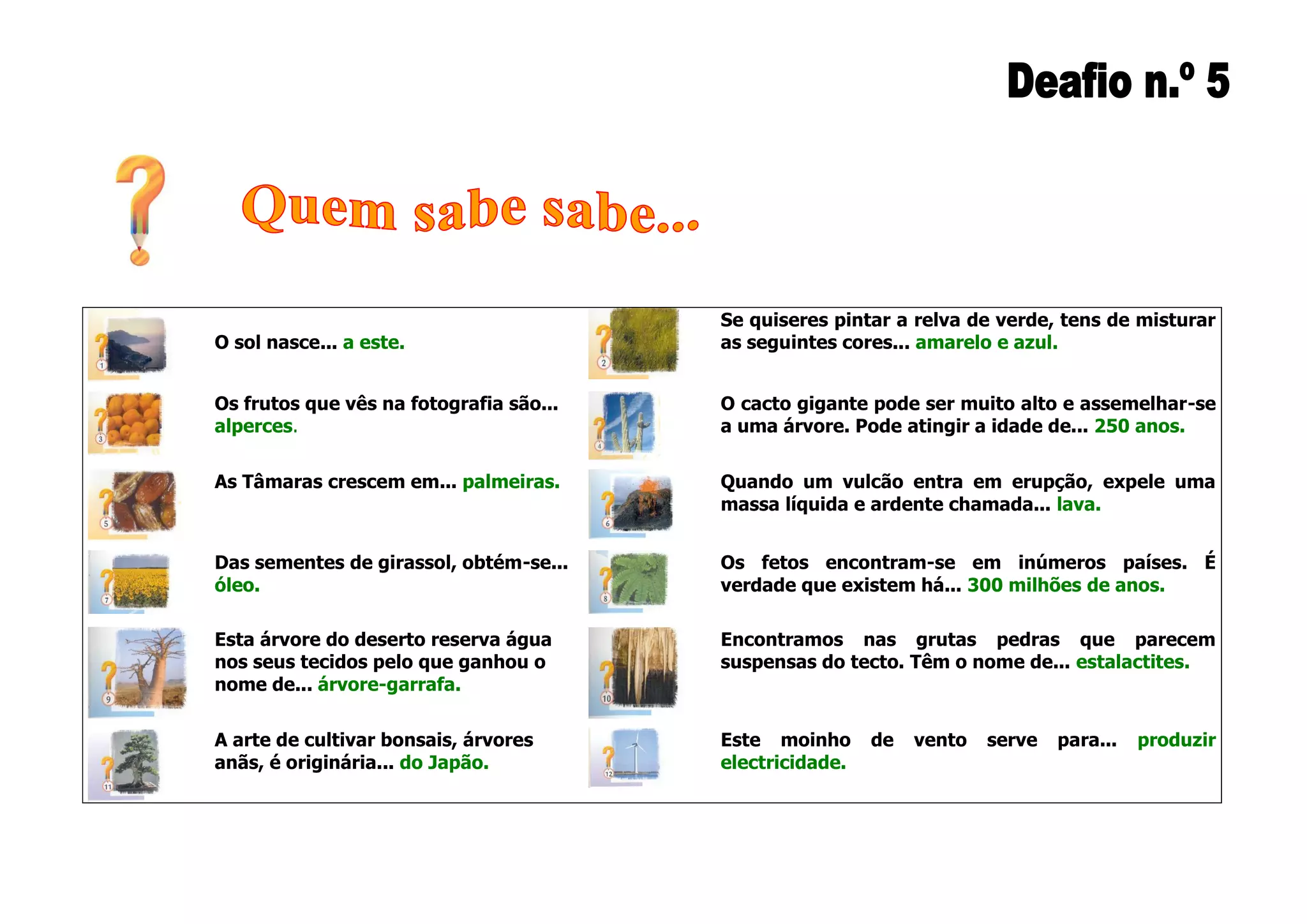 O documento fornece breves informações sobre vários tópicos, incluindo como misturar cores para pintar a relva de verde, que frutos são mostrados em uma fotografia, a idade que um cacto gigante pode atingir, onde crescem as tâmaras, o que é lava expelida por um vulcão em erupção, o que se obtém das sementes de girassol, há quanto tempo existem os fetos, por que uma árvore do deserto é chamada de árvore-garrafa e o que são estalactites