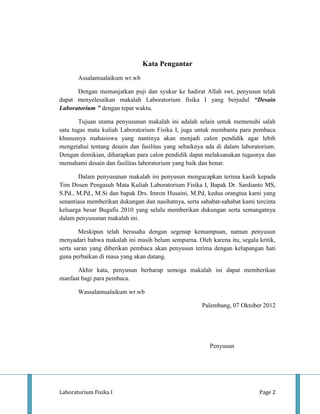Makalah ini membahas desain laboratorium fisika untuk meningkatkan mutu pendidikan, dengan fokus pada fasilitas yang perlu ada, seperti ruang praktikum, ruang guru, ruang persiapan, dan ruang penyimpanan. Selain itu, dokumentasi ini juga menjelaskan pentingnya instalasi air, listrik, dan gas dalam mendukung proses pembelajaran. Tujuannya adalah agar mahasiswa memahami cara merancang laboratorium fisika yang efektif untuk pendidikan.