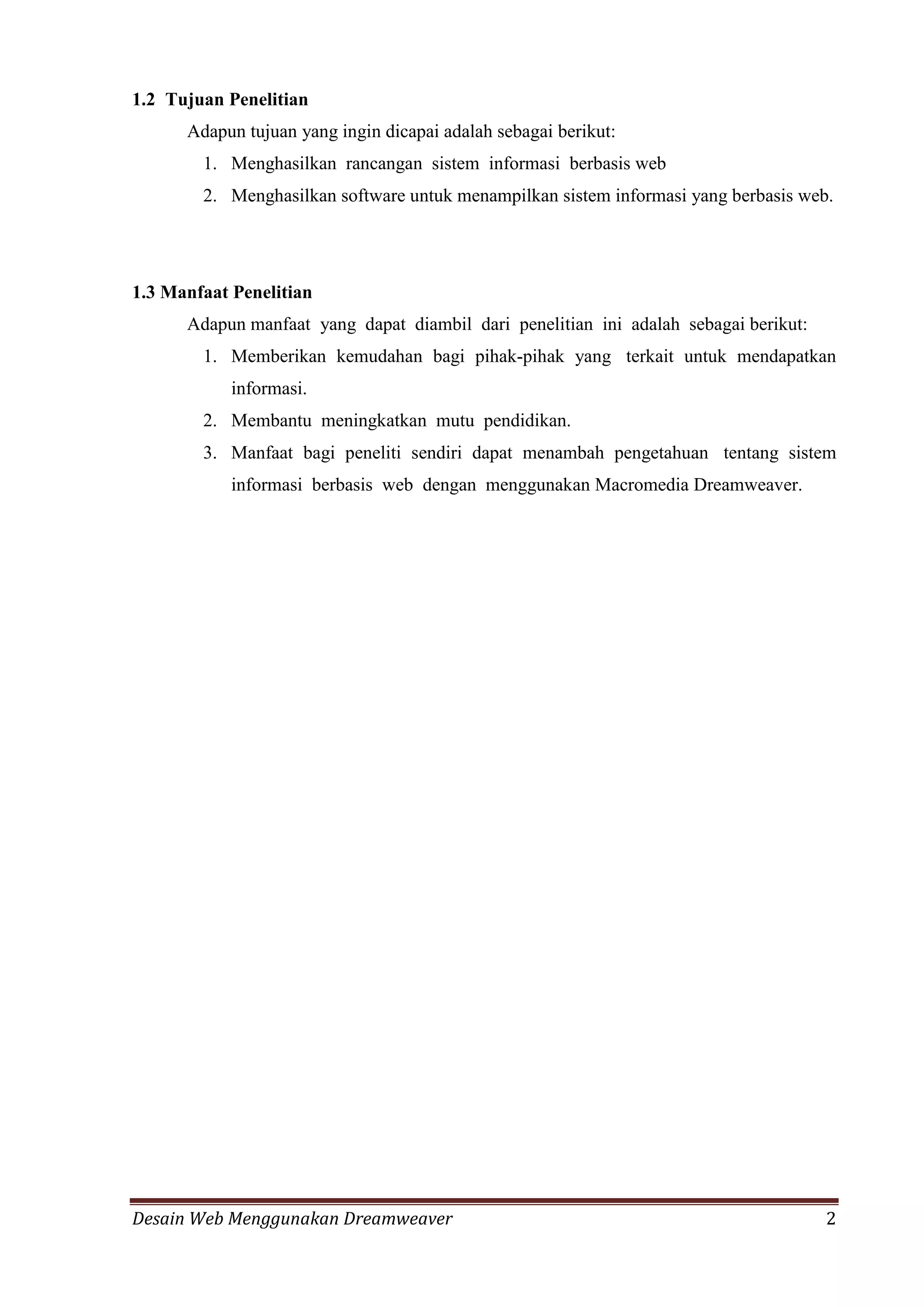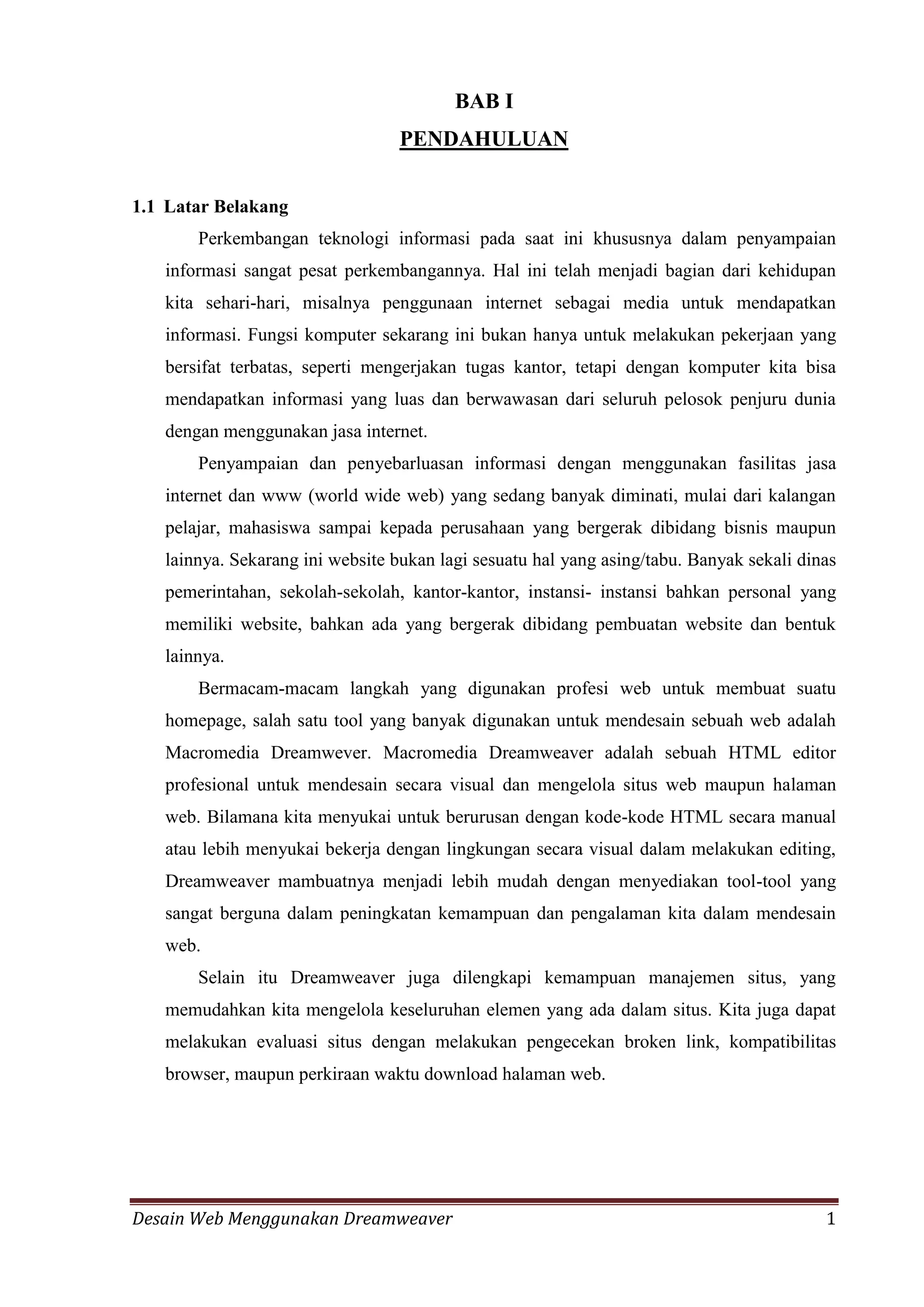 Dokumen ini membahas tentang pemanfaatan Macromedia Dreamweaver sebagai editor HTML profesional untuk desain dan pengelolaan situs web. Ditekankan bahwa Dreamweaver memungkinkan pengguna untuk membuat website dengan mudah tanpa harus menghafal kode HTML, serta memiliki berbagai fitur yang meningkatkan produktivitas. Penelitian ini bertujuan untuk menghasilkan sistem informasi berbasis web dan memberikan manfaat dalam meningkatkan mutu pendidikan serta pengetahuan tentang sistem informasi berbasis web.