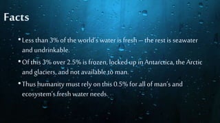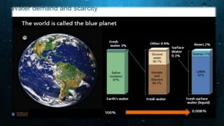 This document provides information about global fresh water resources and desalination. It notes that less than 3% of the world's water is fresh, with over 2.5% frozen in polar regions. The remaining 0.5% must meet all fresh water needs for humanity and ecosystems. It also discusses that fresh water is unevenly distributed globally and many developing nations lack access to clean water. The document then explains water treatment, purification, and desalination processes like reverse osmosis and thermal desalination as methods to produce fresh water from salt or brackish sources.