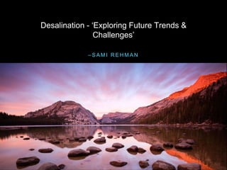 This document discusses desalination and reverse osmosis (RO) as a method for desalination. RO uses pressure to force water through a semi-permeable membrane, removing salts and other impurities. While RO has advantages like versatility and adaptability, it faces challenges like membrane fouling and brine disposal. New technologies like forward osmosis aim to improve RO by further reducing energy use and preventing fouling issues, helping make desalination more sustainable.