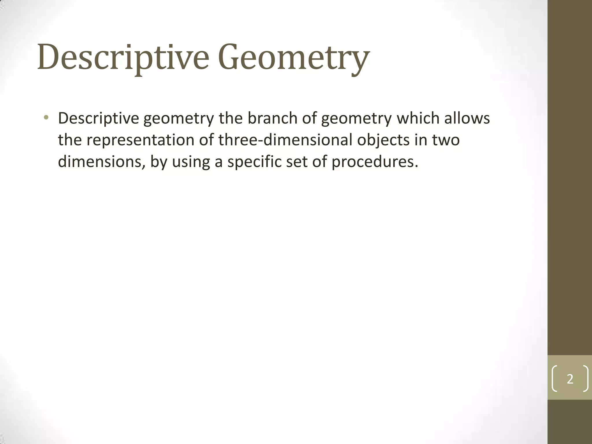 Descriptive geometry allows representing three-dimensional objects in two dimensions using specific procedures. Gaspard Monge developed these techniques in the 1700s. Orthographic projection projects points of an object perpendicularly onto planes of an imaginary glass box to form two-dimensional top, front, and side views. Principal planes are the box faces, while auxiliary planes can be any orientation. Projecting points defines their locations by coordinates in each view, with alignments across views following specific rules.