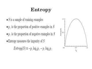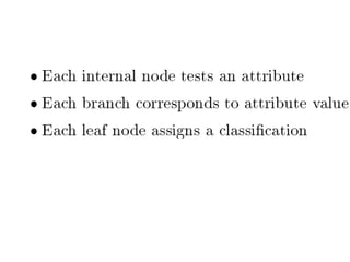This document discusses decision tree learning algorithms. It begins with an introduction to decision trees, noting that they are widely used for inductive inference and represent learned functions as decision trees. It then discusses appropriate problems for decision tree learning, including instances represented by attribute-value pairs and discrete output values. The document provides examples of different decision tree algorithms like ID3, CART and C4.5 and explains the ID3 algorithm in detail. It also discusses concepts like entropy, information gain and using these measures to determine the best attribute to use at each node in growing the decision tree.