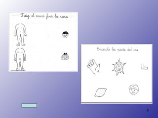 Objectius didàctics -Demostrar autonomia en els hàbits relacionats amb la pròpia neteja, higiene i salut. Mostrar les emocions, els interessos i les preferències utilitzant el llenguatge corporal com a mitjà d’expressió i comunicació. Indicar quins elements corporals es poden utilitzar per obtenir una determinada informació sobre el propi cos. - Indicar les parts externes del cos, i algunes de les seves funcions i utilitats. Distingir característiques d’algunes parts del cos: dures/toves, mòbils/immòbils, les parts que n’hi ha una/que n’hi ha dues, que s’obren i es tanquen, que poden produir sorolls i sons. - Identificar-se amb les característiques del propi grup sexual. Participar de forma activa en las activitats que proposem i col·laborar en la preparació de les activitats. - Mantenir l’atenció i l’esforç necessaris per acabar les activitats començades. - Mostrar confiança en les pròpies possibilitats en qualsevol realització. - Aplicar el nom correcte a cada part del cos. - Imitar i reproduir cançons i danses mitjançant el cos i el moviment. - Reconèixer en imatges qualitats de les parts del nostre cos treballades.