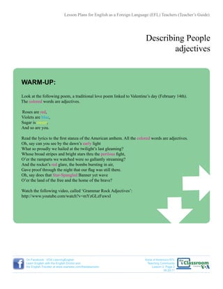 This document provides a lesson plan for teaching English adjectives to EFL students. It includes warm-up activities with poems and songs containing adjectives. Students then practice describing people using adjectives. Definitions and examples of adjectives are provided. Exercises have students identify adjectives, find intruders, and describe people and situations using adjectives. The lesson concludes with a role-playing activity and wind-down songs to identify adjectives.