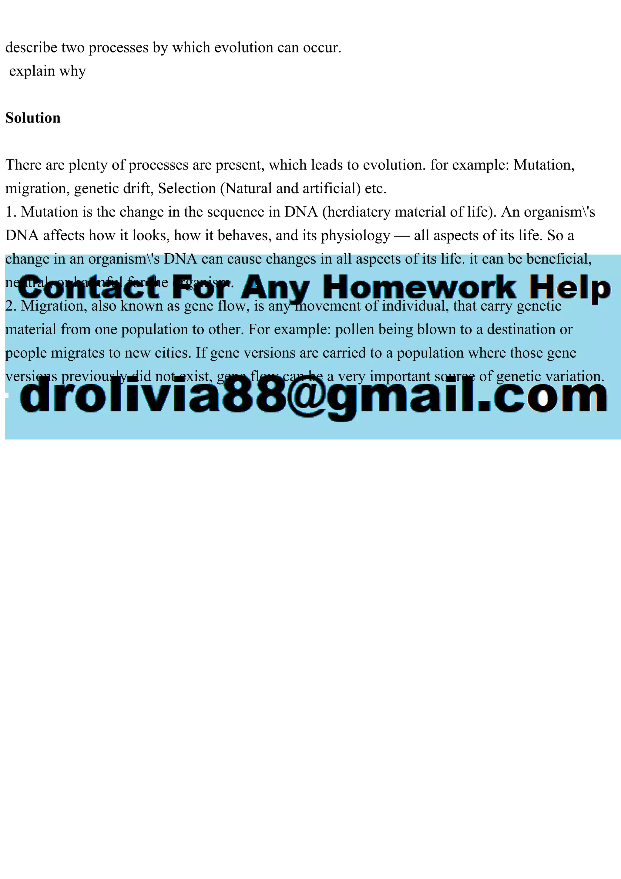 The document describes two key processes of evolution: mutation and migration. Mutation refers to changes in DNA that can impact an organism's traits positively, negatively, or neutrally, while migration, or gene flow, involves the movement of genetic material between populations, introducing new genetic variations. Both processes contribute significantly to the diversity of life and the evolution of species.