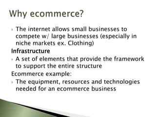 The document discusses several key considerations for operating an internet marketing website, including infrastructure requirements, accessibility, costs, payment options, and outsourcing design and maintenance. Specifically, it notes that infrastructure must provide framework support, accessibility involves considerations for those with disabilities, costs include initial design and ongoing hosting/maintenance, payment options include forms and transaction processing, and outsourcing can save resources but lose some control.