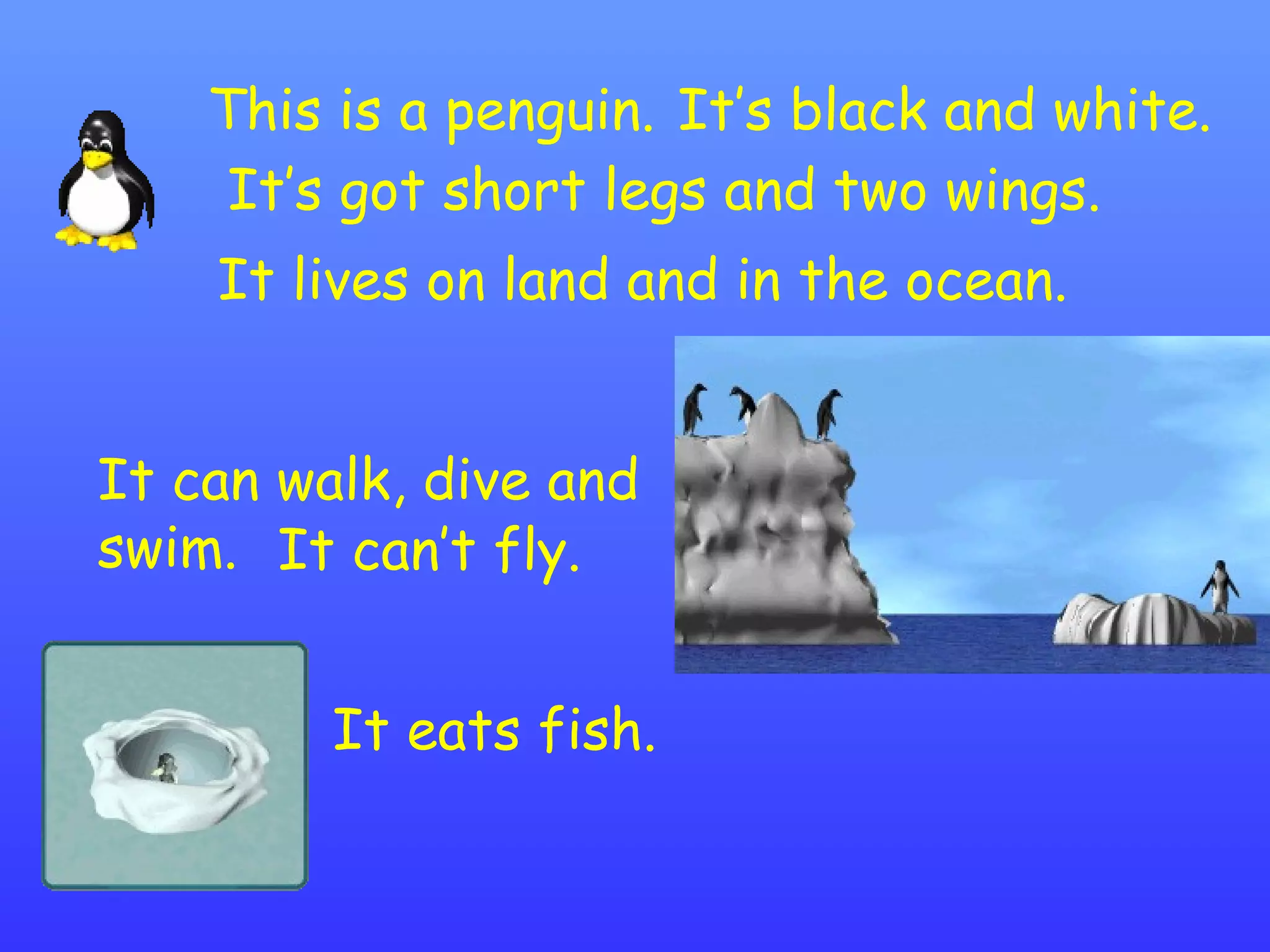 This document provides information about penguins and asks questions to determine if statements are true or false about a squirrel. It then asks questions about the characteristics of a favorite animal and prompts the reader to draw a picture and write about it.