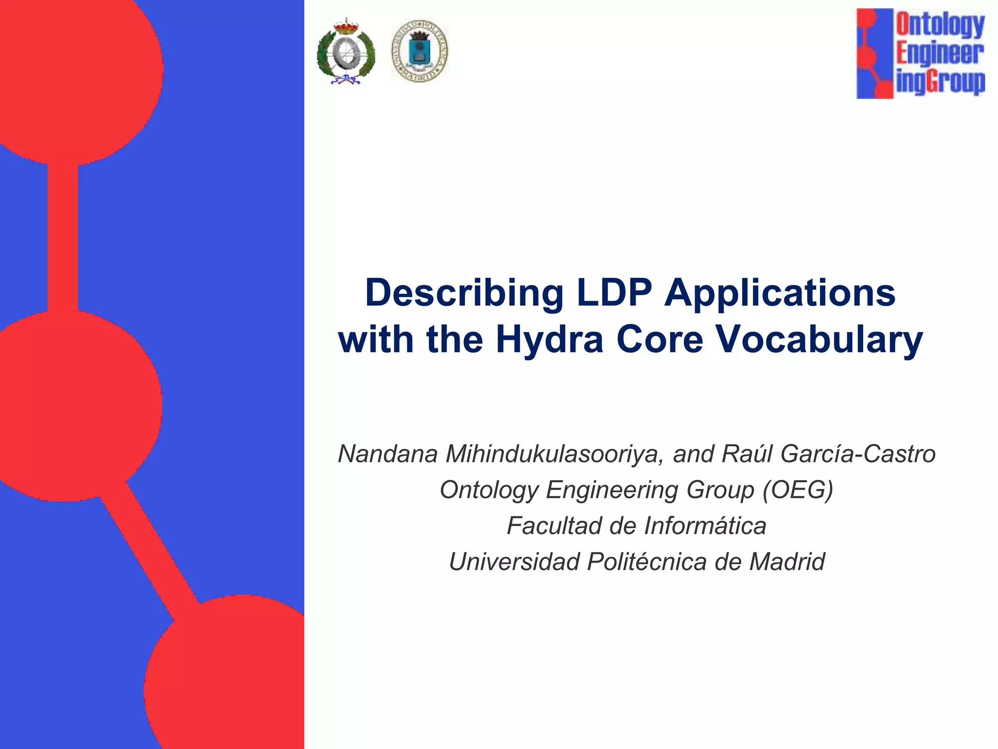 The document describes how to model an address book application using the Linked Data Platform (LDP) and Hydra Core Vocabularies. It provides examples of modeling an address book container and contacts as LDP resources, supporting common operations like GET, POST and PATCH. It also shows how to describe the application's API using the Hydra Core Vocabulary, including supported classes, operations and documentation. Potential conflicts between LDP and Hydra concepts like containers vs collections and paging are discussed.