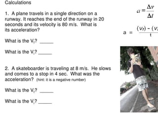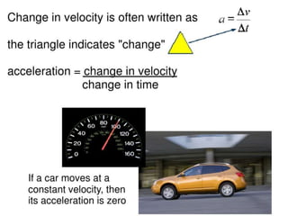 2. Acceleration occurs when velocity increases, decreases, or changes direction. It is the rate of change in velocity over time.