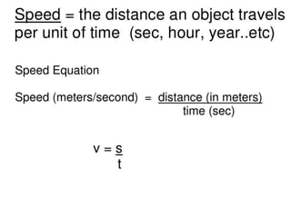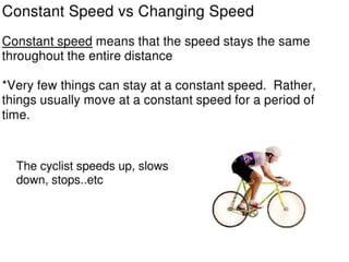 This document discusses distance-time graphs and their relationship to speed, velocity, and acceleration. It contains the following key points:
