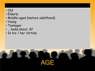 This document provides a vocabulary for describing people including their age, height, figure, shape, face, eyes, nose, mouth/lips, hair, character/personality, and clothing.