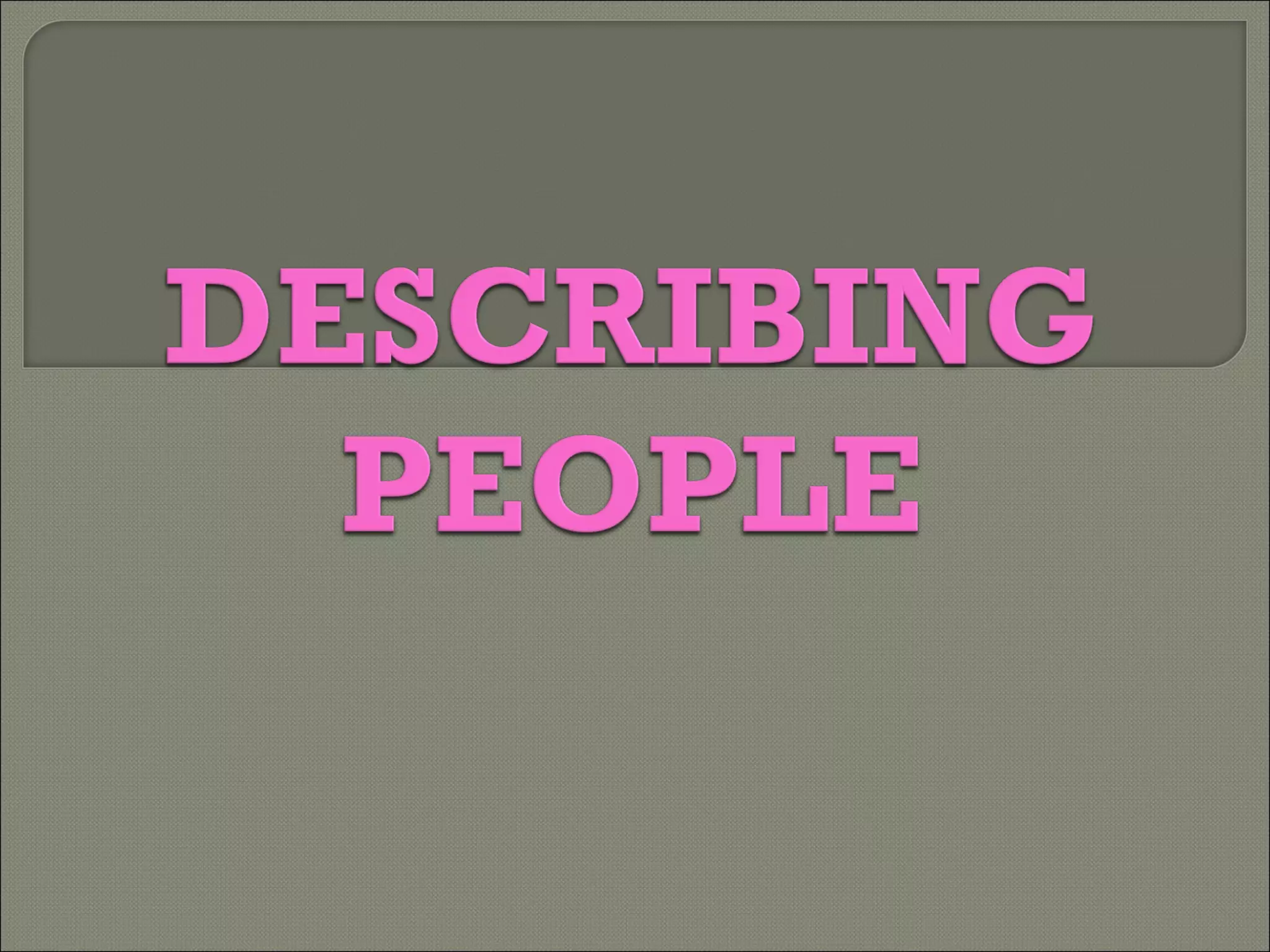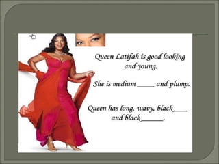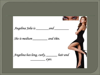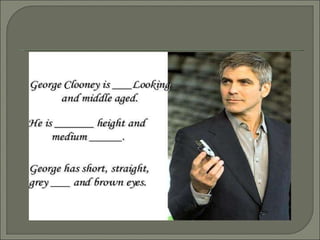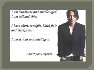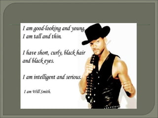The document provides guidance on describing physical appearance and personality characteristics of individuals. It lists common traits to note for height, weight, age, eye color, hair, skin, and general aspect when describing physical appearance. For personality, it lists characteristics such as lazy, talkative, funny, brave, and annoying. The purpose is to provide a framework for describing people.