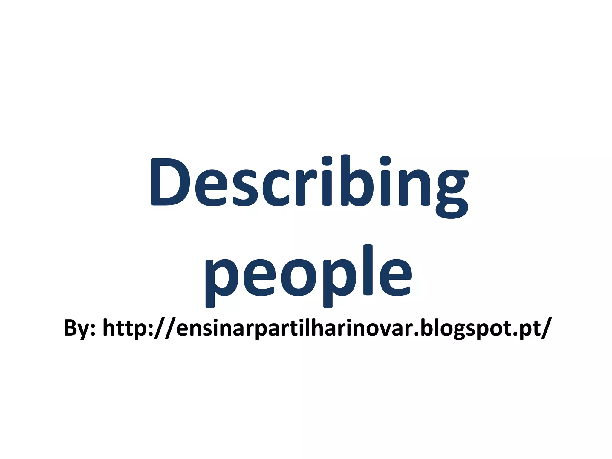 The document describes common ways to describe people's physical appearance including their age, hair, height, weight, facial features, and overall look. It provides vocabulary words for different ages, hair styles, colors, heights, body types, accessories, and features. Examples are given for describing a person's hair, features, and overall appearance in sentences.
