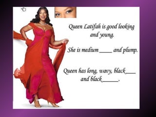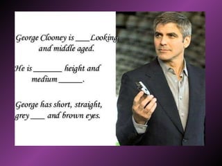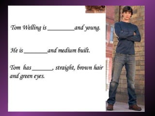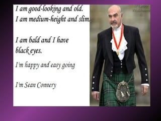 This document describes how to summarize people based on their physical appearance and personality characteristics. Physical appearance can be described through height, weight, age, eye color, hair, and skin. Personality characteristics include traits like lazy, talkative, cruel, easygoing, happy, sad, funny, brave, charming, bad-tempered, careless, and annoying. The document provides examples of describing specific people and prompts the reader to describe themselves.