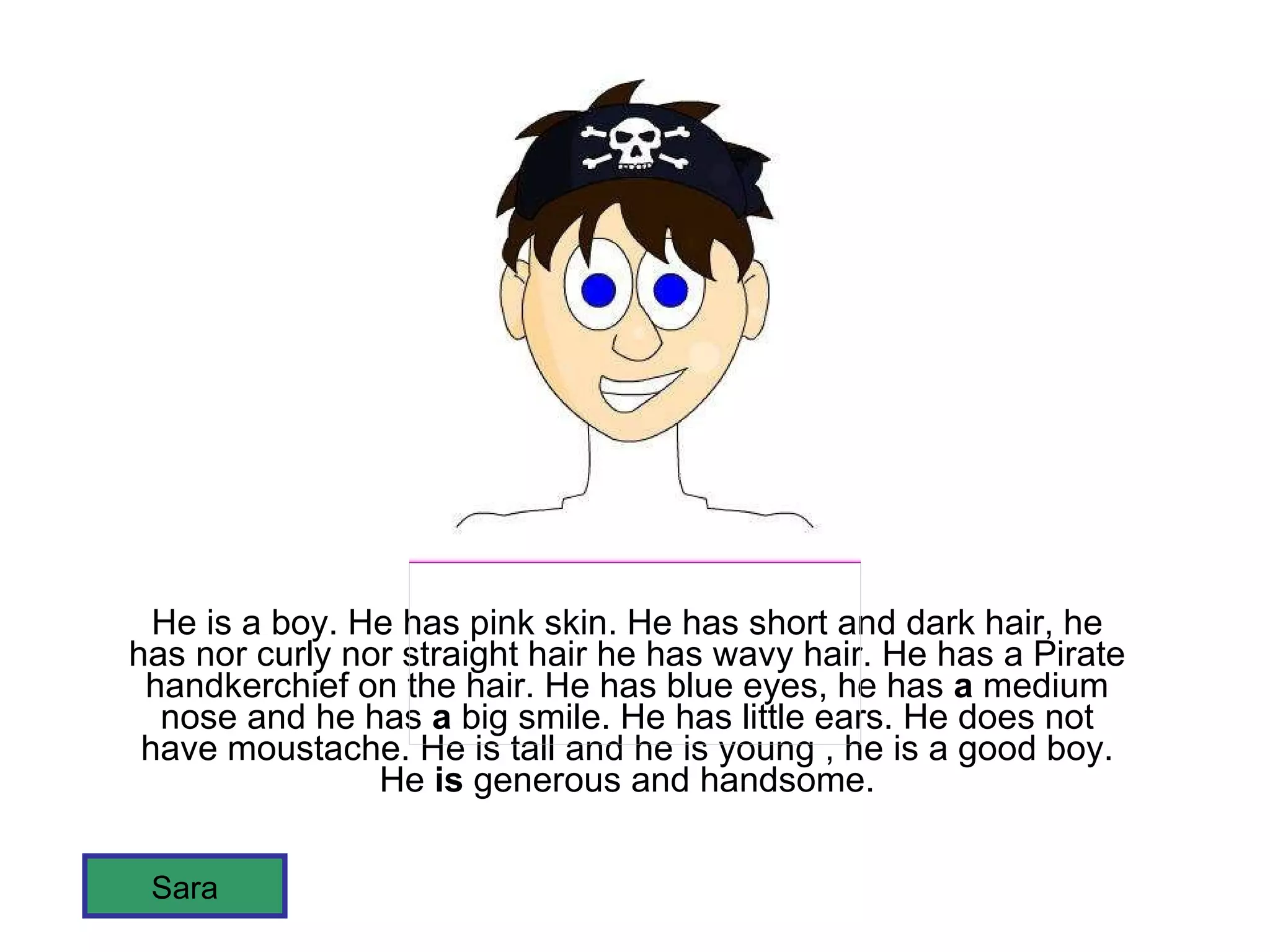 The document contains descriptions of several characters provided by different students. The characters described include boys, girls, men and women of various ages, ethnicities, and physical attributes such as hair color, eye color, facial features, accessories, and more. The descriptions provide the characters' names, select physical traits, sometimes including age, nationality or other details to portray each individual character.