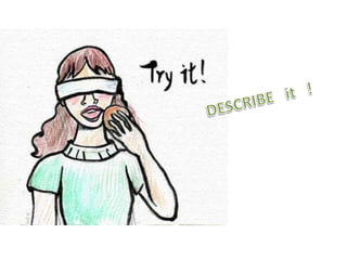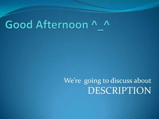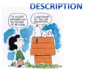 Description is one of four rhetorical modes used to transmit information and stories. It works to translate visual information, like images, into spoken words to make works accessible to those who are blind or visually impaired. Description is commonly inserted into movies, television shows, and other video-based media to provide details between dialogue or other audio. An example is given of describing a person's physical appearance with details about their hair, eyes, age, and other characteristics.