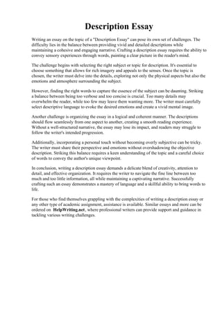Writing a description essay is challenging as it requires striking a balance between vivid imagery and cohesive narrative flow, with careful word choice to evoke emotions and create a clear mental picture. The document discusses the importance of selecting a rich subject, detailing physical attributes and emotions, and organizing the essay logically to maintain reader engagement. Ultimately, crafting a successful description essay showcases the writer's command of language and ability to bring experiences to life.