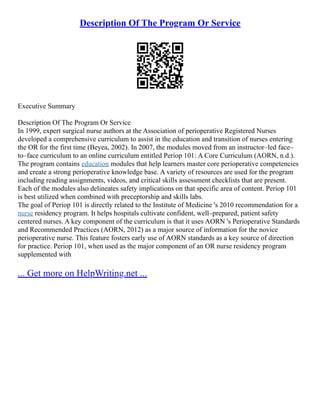 Periop 101 is an online curriculum developed by AORN to help nurses new to the operating room master core perioperative competencies through modules containing readings, videos, and skills checklists. The goal of Periop 101 is to cultivate confident and well-prepared nurses centered around patient safety, in line with the IOM's recommendation for nurse residency programs. When used as a major component of an OR nurse residency program supplemented with preceptorship and skills labs, Periop 101 fosters the early adoption of AORN standards as the foundation for novice nurses' practice.