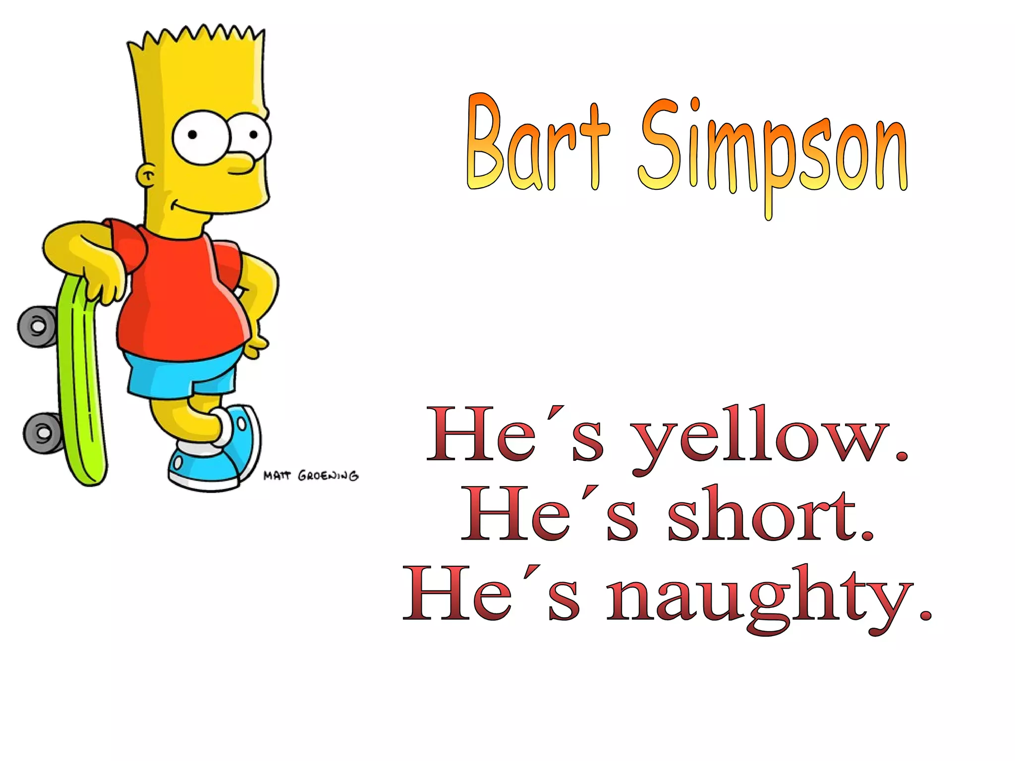 The document describes four characters - Bart Simpson, Eva Amaral, Laura, and Hannah Montana. It provides brief physical descriptions for each, noting their gender, appearance traits like hair length, and for Bart Simpson and Hannah Montana, their age and personality traits.