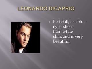 The document describes the physical appearances of 5 celebrities - Leonardo DiCaprio, Cameron Diaz, Will Smith, Tom Cruise and Katie Holmes, and Rafael Novoa. It notes their hair color, eye color, skin tone, and sometimes height for each celebrity.