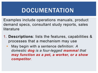 This document discusses different types of documentation and provides tips for writing documentation. It covers three main types: descriptions which list features and capabilities, process analyses which explain how something works, and instructions which provide step-by-step guidance. The document then gives tips for writing documentation such as using an introduction, lists of materials, simple language, and visual cues like diagrams and numbered steps. It also discusses lessons learned from user testing, such as images being more valuable than text and the importance of clear, consistent visuals and instructions that don't frustrate inexperienced users.