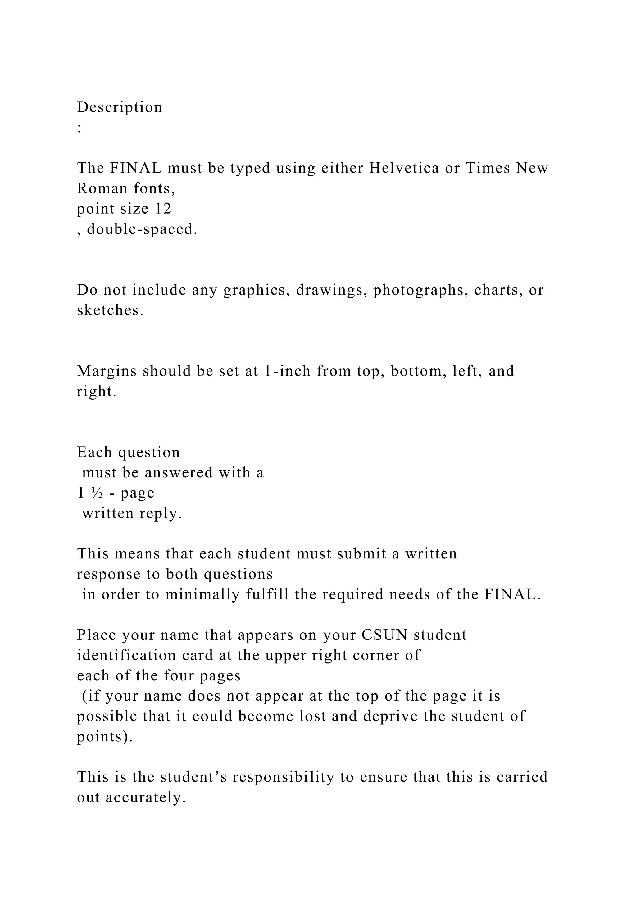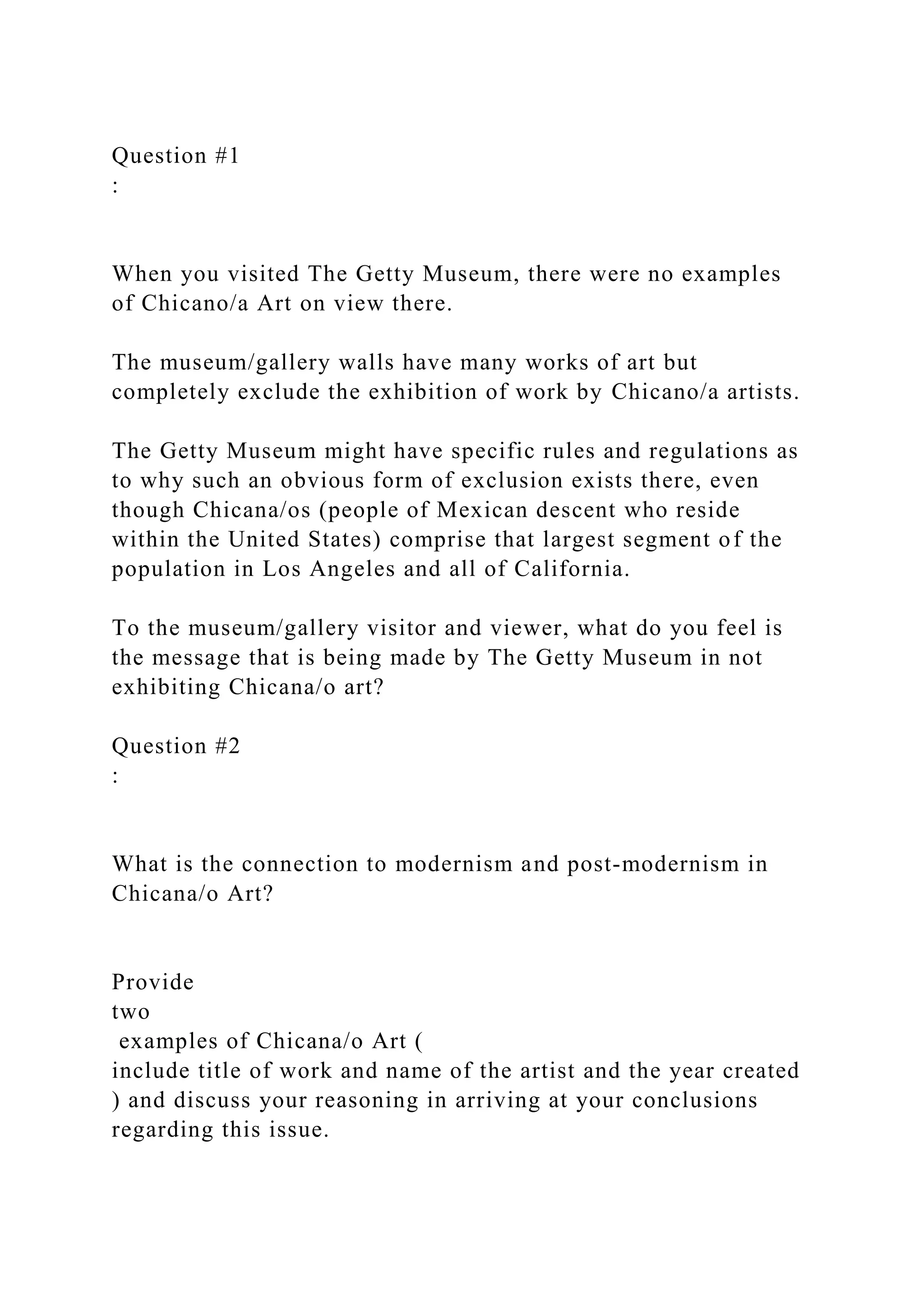 The document outlines the requirements for a final assignment, specifying formatting details such as font type, size, spacing, and margins. Students must answer two questions regarding the absence of Chicano/a art at the Getty Museum and its connection to modernism and post-modernism, while providing examples of Chicano/a art. Each response should be 1.5 pages long, and students must include their name as it appears on their student ID on each page.
