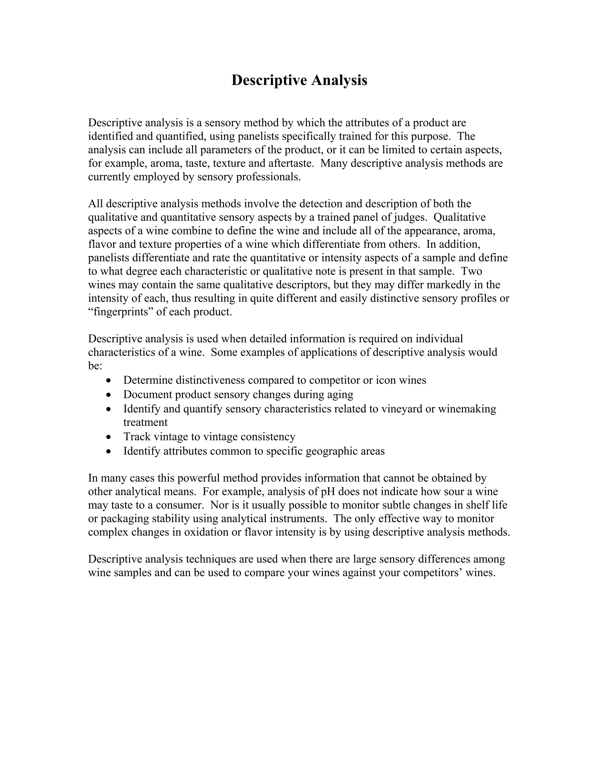 Descriptive analysis is a method using trained panelists to identify, quantify, and describe the qualitative and quantitative sensory attributes of a product. Panelists detect and rate characteristics like aroma, taste, texture, and aftertaste. This analysis provides detailed sensory information about products that can help determine distinctiveness, document changes over time, identify attributes related to production methods, and track consistency. It offers insights not available through analytical chemistry alone.