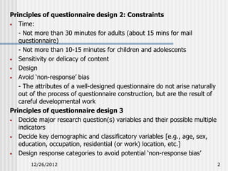 The document discusses principles for designing effective questionnaires. It recommends limiting questions to those most relevant to the research questions, pre-testing questions on sample populations, and keeping questionnaires brief, typically under 30 minutes. It also advises avoiding double-barreled or negatively-worded questions, and carefully considering the ordering and structure of questions.